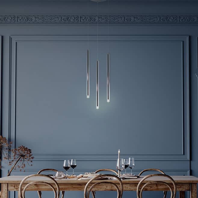 La suspension L3 se décline en suspension L5 avec trois points lumineux et en suspension unique L1.